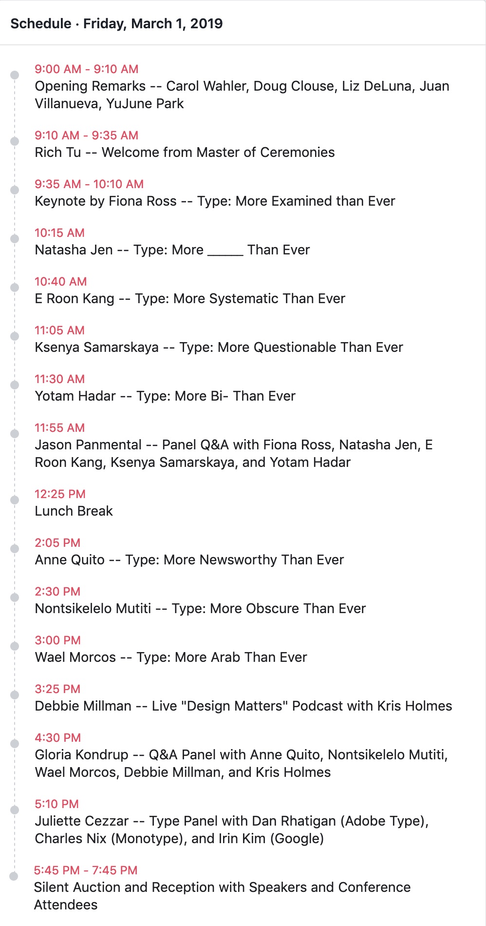 Our exciting lineup includes two of the most influential typeface designers of the 21st century, Fiona Ross and Kris Holmes, along with a new generation of designers and thinkers who are making type more accessible, more global, and more exciting than ever before.