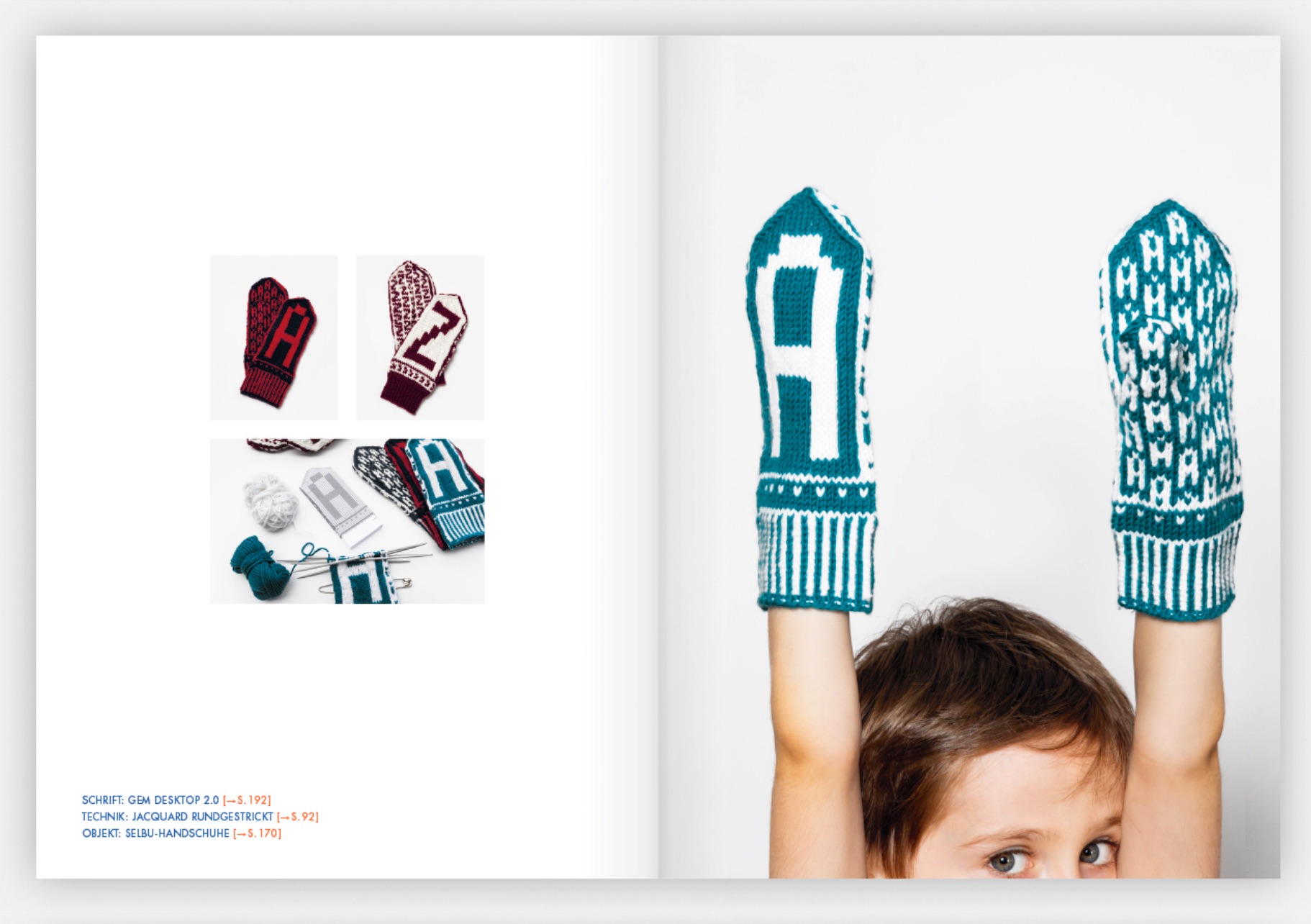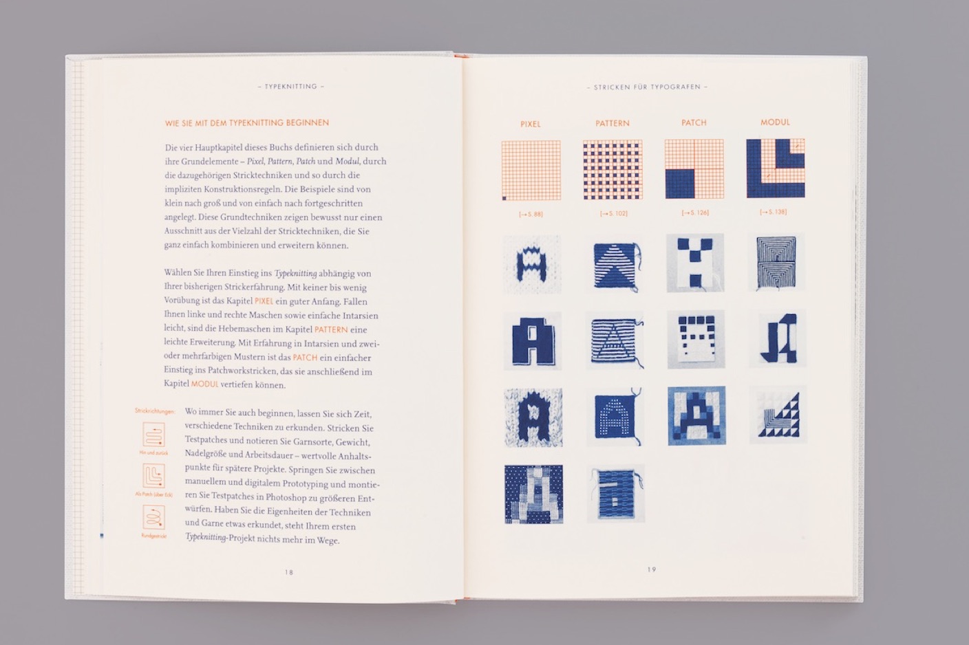 I experienced knitting as a very technical and logical practice, like analog programming. But looking only at the knitted artefacts, this is often rarely visible. I wanted to show this perspective to initiate a fresh, unbiased dialogue between knitting and typography. I chose to reduce the techniques to their structural basis using an instruction manual-inspired aesthetic. The two contrasting colors blue and orange distinguish between instructions and outcomes, between source code and artefact. In this way, the book hopefully appeals to knitters and typographers equally.
