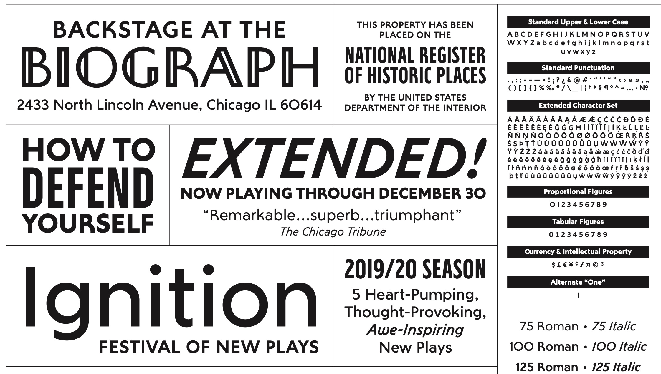 At the moment I work full-time as an in-house graphic designer at a regional theater in Chicago. Most of my work there consists of making simple layouts for print and web ads, program booklets, show posters, and so on. Outside, I continue to pursue my typeface designs for commercial release. As of now, I have five full type families commercially available through my personal type studio Typetanic, some of which have been used by such high-profile clients as NBC Universal, Major League Baseball, and BuzzFeed. In addition, I have several other typeface designs in various stages of completion. Ideally in the future, I’d like to work on my type designs and lettering on a more full-time basis.