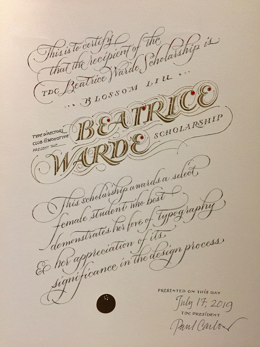 Blossom received the award at the public ceremony from Deborah Gonet of Monotype and TDC executive director Carol Wahler. At the request of Dr. Shelley Greundler, one of the scholarship selection committee members, award-winning illustrator Kriti Monga of Tumeric Design in New Delhi lettered the official scholarship certificate.