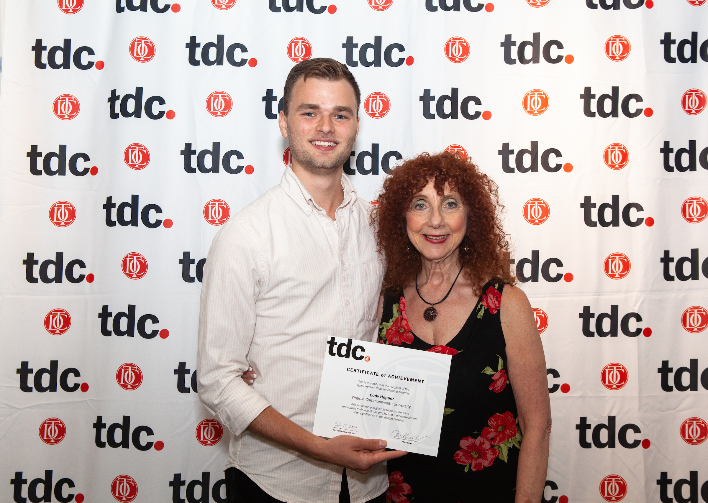 Cody Hopper, a student at Virginia Commonwealth University holds his certificate of achievement with executive director Carol Wahler at TDC awards night at The Cooper Union. Photo: Mélanie Duault