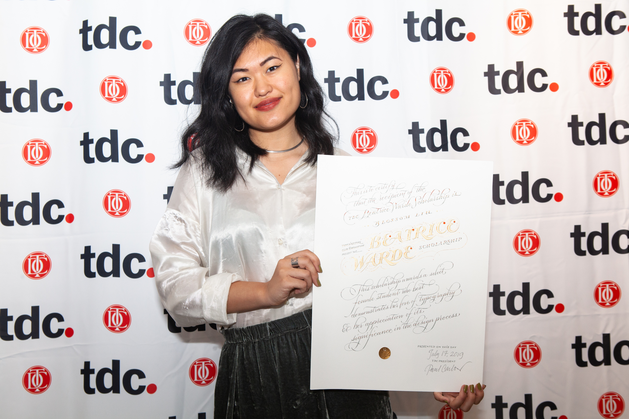 Blossom received the award at the public ceremony from Deborah Gonet of Monotype and TDC executive director Carol Wahler. At the request of Dr. Shelley Greundler, one of the scholarship selection committee members, award-winning illustrator Kriti Monga of Tumeric Design in New Delhi lettered the official scholarship certificate.