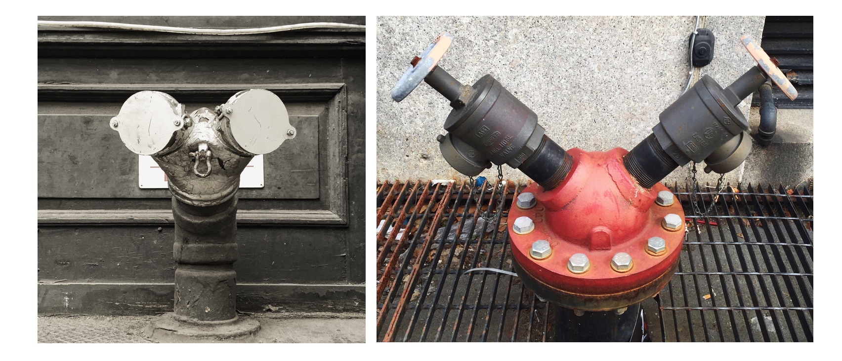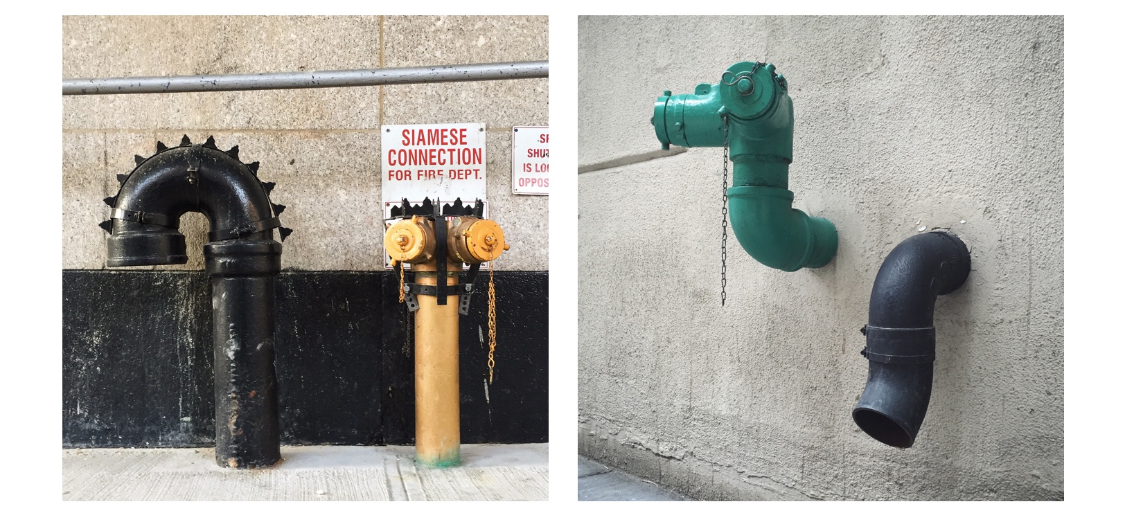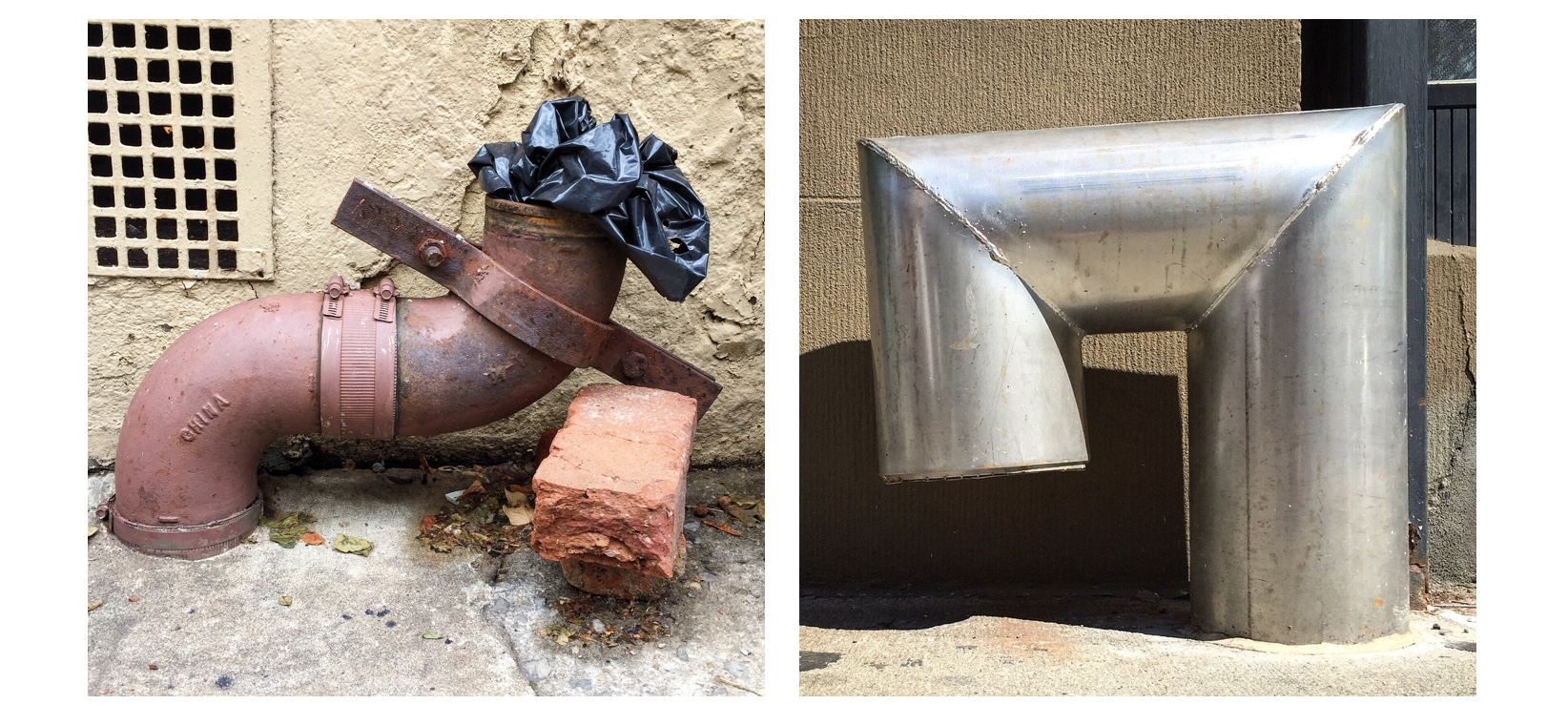 I think the pipes came along because I was taking pictures of signs all the time. The more you look, the more you see, right? I started noticing pairs or groups of various kinds of standpipes, drainpipes, and vents on the street that seemed to bear some kind of relationship to their environment or to each other, almost as if they suggested some kind of a story. I started taking pictures of them. Then one day, defying my better judgement, I posted my first few, certain that I was about to be universally unfriended and unfollowed. Much to my surprise, they started getting likes.