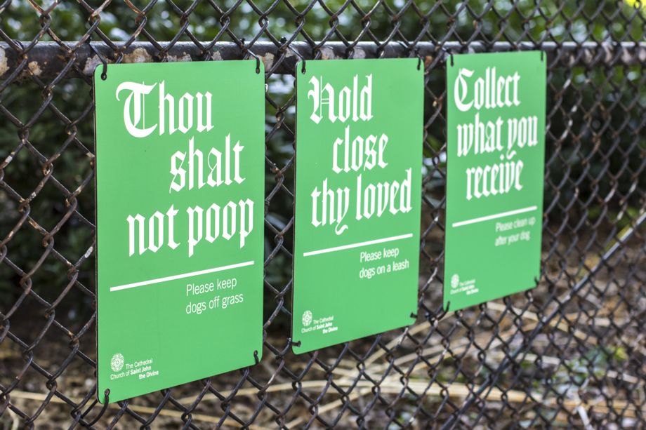 Bierut and Jesse Reed's signage design for the Cathedral Church of St. John the Divine. A series of signs gently remind visitors to pick up after their pets.