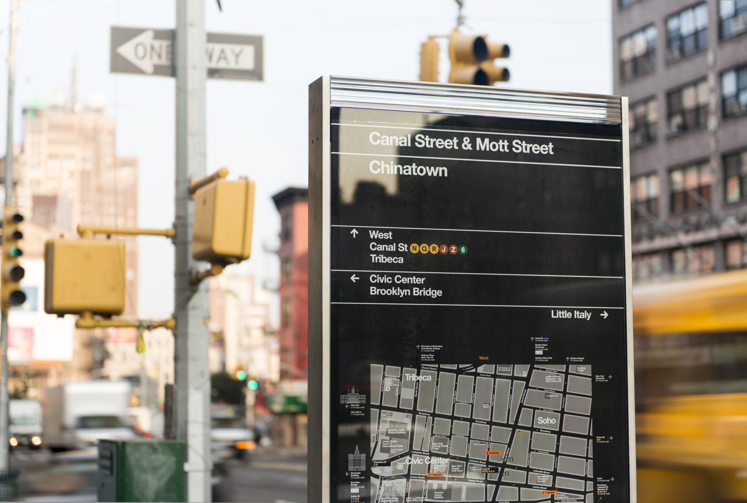 New York Department of Transportation, WalkNYC wayfinding kiosk. Designed by Bierut's team.