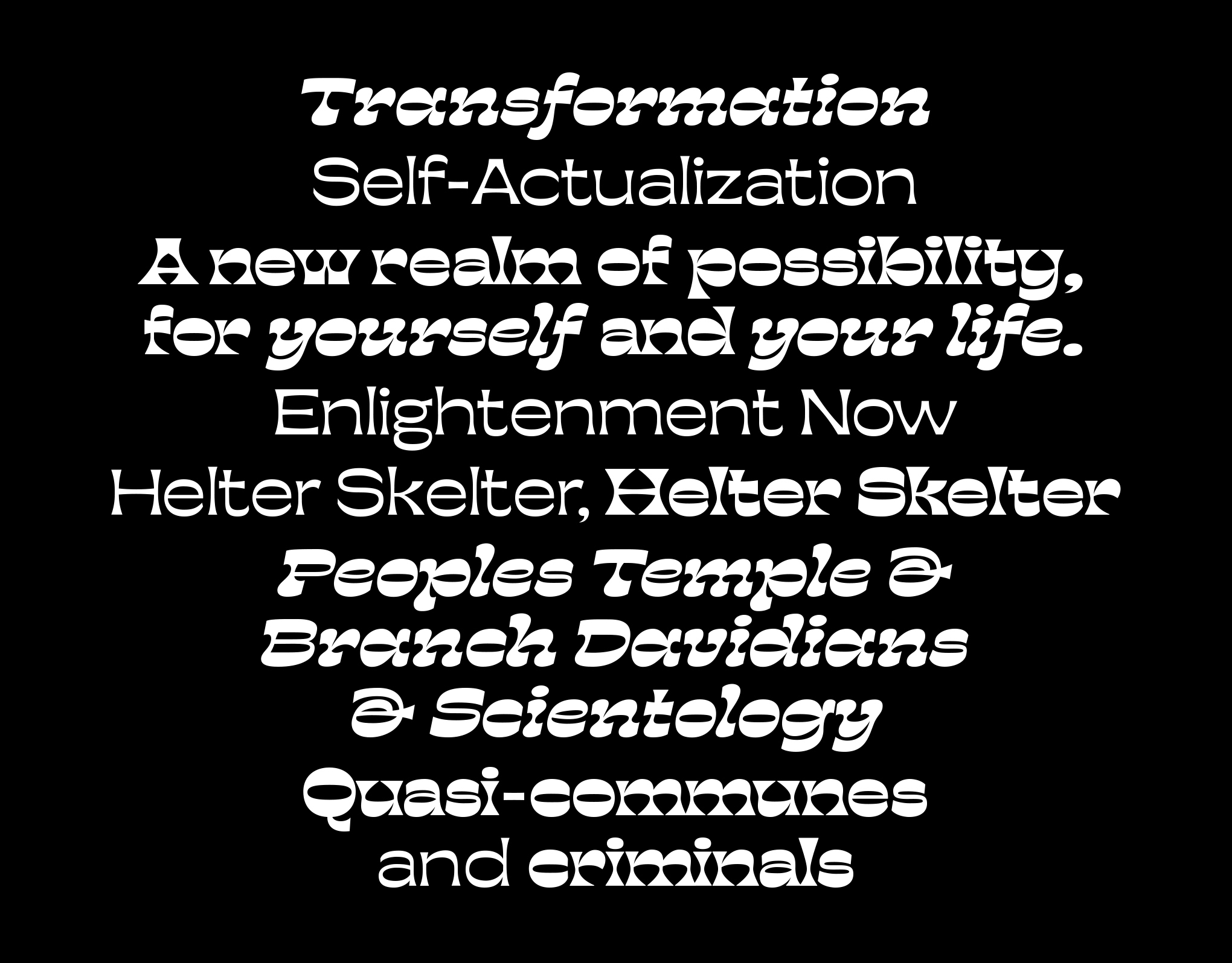 My proposal was to create a typeface inspired by cults. Where this idea came from, I have no idea. Like many people, I find cults fascinating and was legitimately curious about what a typeface would look like if it was visually derived from these groups. In a weekend workshop, I began sketching reverse contrast letterforms and realized that it was the perfect approach to my project. Aesthetically, it communicated the underlying, sinister nature of cults while also referencing their “unconventional” nature through the reversal of “normal” contrast. At the end of the program, I had developed a regular, bold, and bold italic weight.