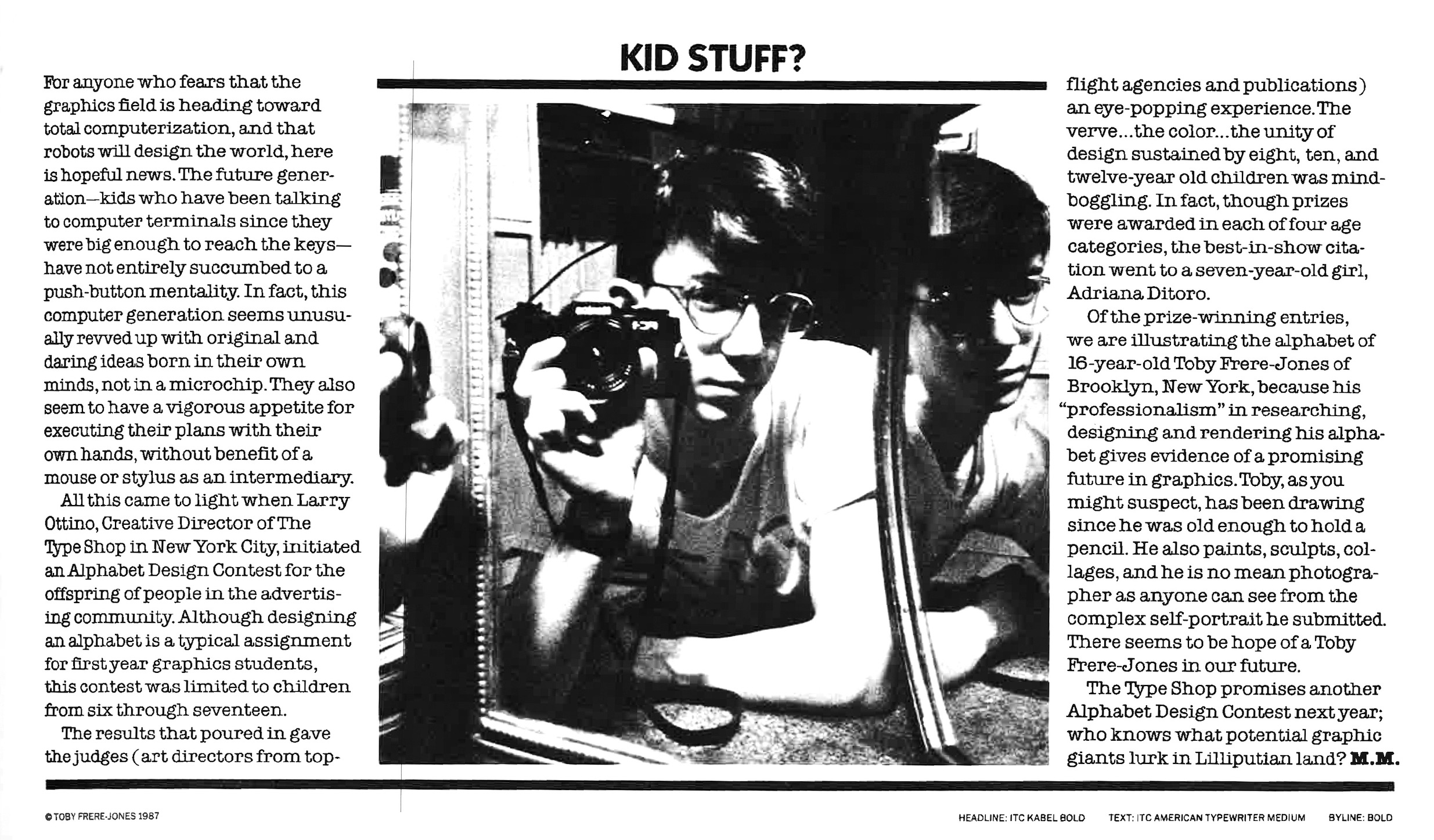 Toby Frere-Jones portrait in Alphabet Design Contest article in 1987 issue of U&lc magazine.