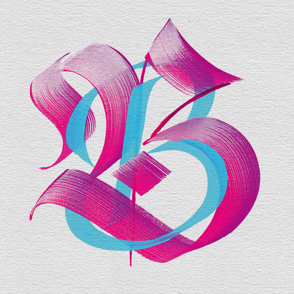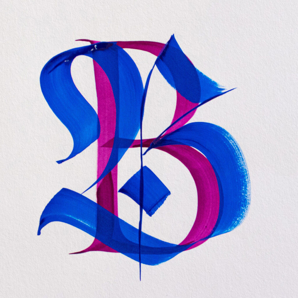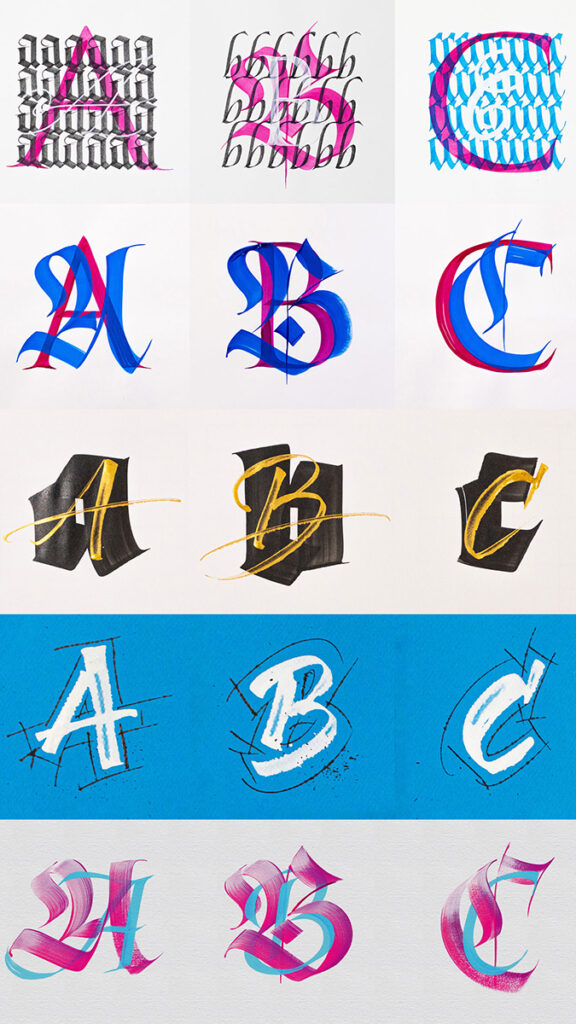 In 2020, after a decade of practicing calligraphy, I began experimenting more freely with abstract brushstrokes and hybrid alphabets. What started as daily practice grew into a body of work where Gothic structures and Roman capitals intertwine with fluid scripts, creating tension and harmony in every letter. These explorations became central to my style, evolving from ink and paper to digital experiments crafted on the iPad with custom brushes I developed.