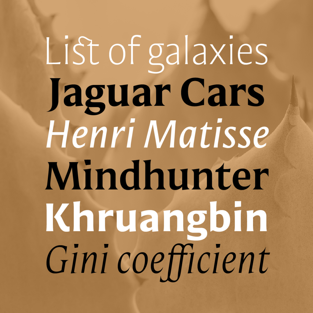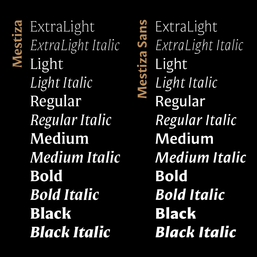 A few years ago, I designed a logo for a mezcal brand that was never implemented, but the typographic shapes proved valuable to me. I set out to create a typeface that captured that spirit, preserving the essence of European typography while integrating the crisp, organic forms of the agave. After considering several names, Mestiza stood out for its stability and symbolism. It reflects who we are: a rich blend of history and culture. The project soon expanded to include a sans-serif version, broadening its range of uses. Mestiza is one of our most rewarding typeface families, as it developed naturally and has been well-received by users for a wide range of products, brands, and institutions. We will soon be launching a text version to expand its versatility further.