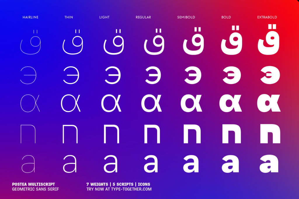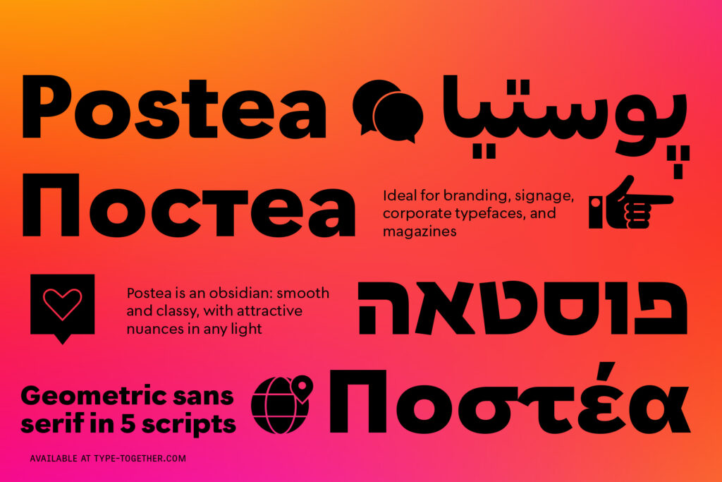 Postea is an obsidian: smooth and classy, with attractive nuances in any light. The classic curves and purposeful details keep its individuality intact while allowing it to fit an incredible range of geometric font needs. Because of these qualities, Postea makes normal reading in paragraphs a cinch and your branding memorable.